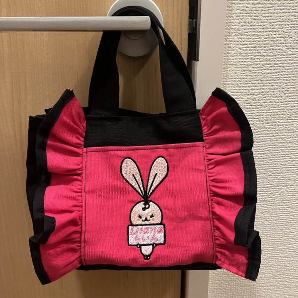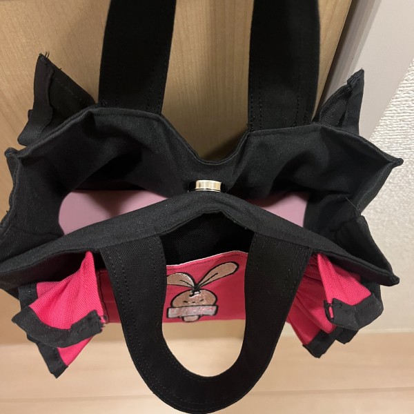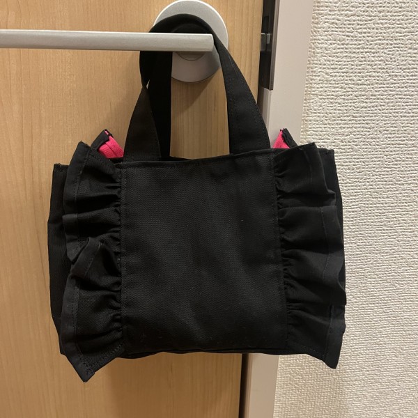 刺繍機能付きのミシンを買ったので刺繍を入れる練習のついでにフリルミニバッグを作成しました。前回の作品で余った裏地布を使いました。裏面は黒一色でシンプルに。
