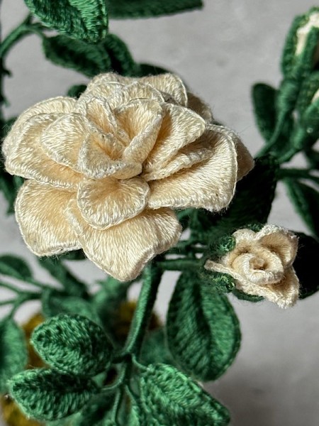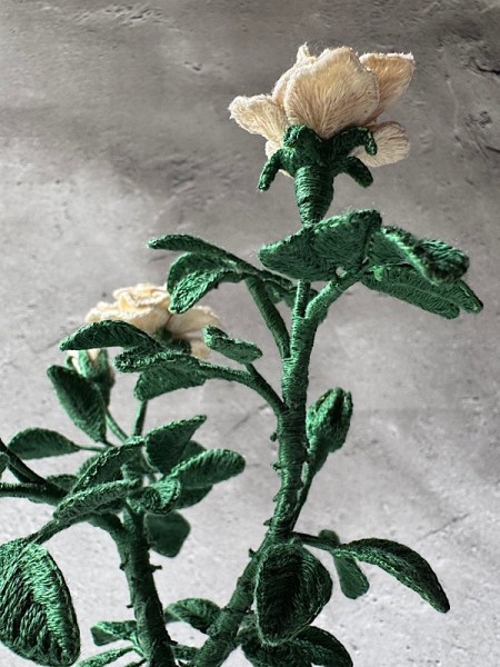 薔薇の花や葉はもちろんのこと、薔薇の棘まで刺繍糸で表現しました。