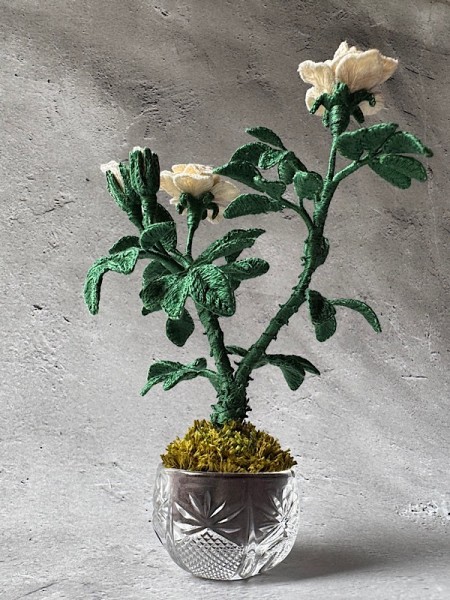 白いミニ薔薇をモチーフに、刺繍したパーツを組み立てて作品を作る「立体刺繍」という技法で作品を作りました。