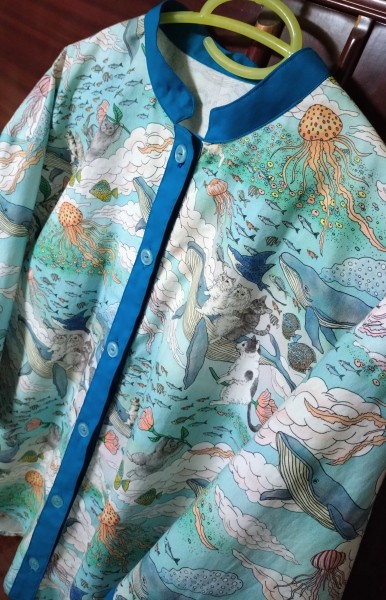 襟の曲線とボタンホールをちょっと失敗したけど、完成!