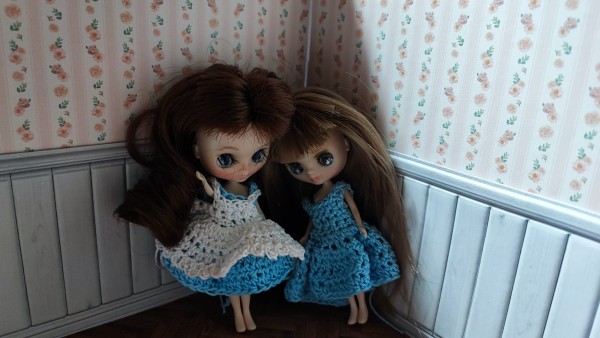 身長約11センチのドールちゃんたちにレース糸で編みました。