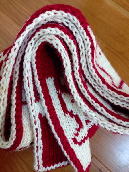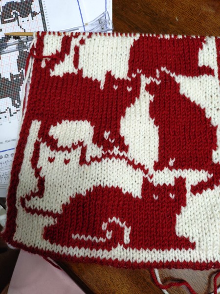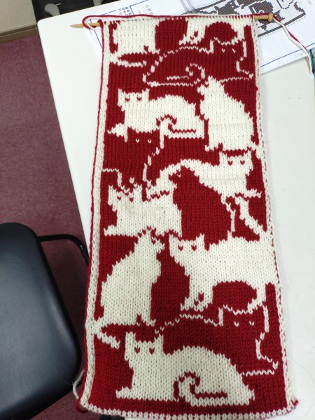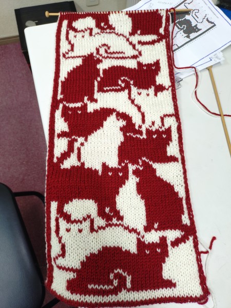 前回は中間部分に模様を入れずに編んだので、今回は全面に猫柄を編み込むことにしました。
