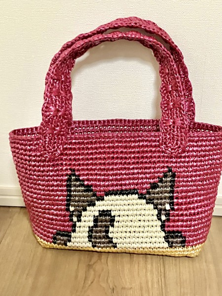 ビニールテープでシャム猫の柄のバッグを編みました。