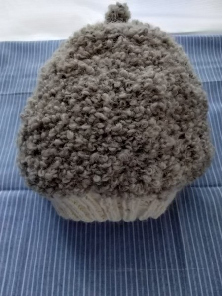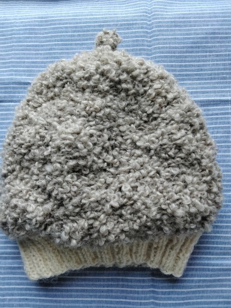ひつじのイメージ糸なのに、フクロウの子供みたいな帽子に、、、