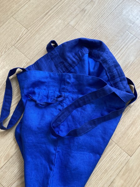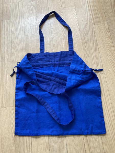 手持ちのオリエンタルブルーのリネンで巾着バッグを作りました。