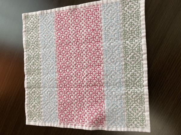 | 刺し子本の「刺し子デザイン帖」のなかの十字花刺しアレンジです。さらしはオリムパスの十字花刺しふきんを使いました。 糸端は固結びで始末しています。今回のように寄せ模様の時は、まず中心のピンクを完成させ、水色、緑と刺しています。 光に透けると、ピンク糸の結び目もわかってしまいますが、透かさなければあまり目立たないかなと思っています。 |
