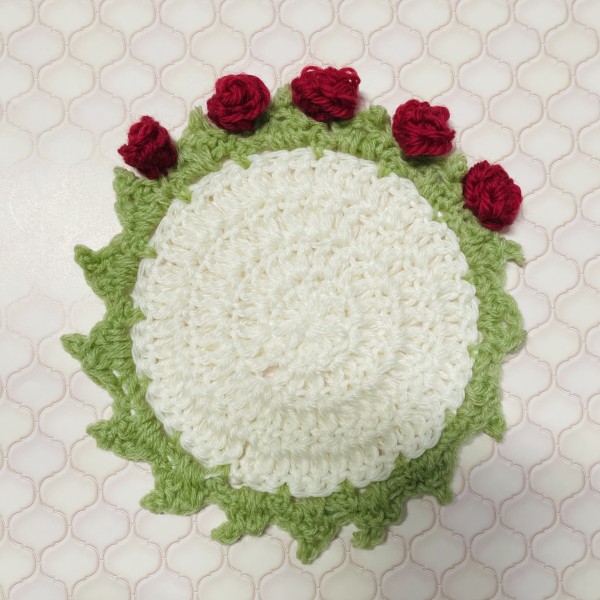 | バラをモチーフにしたかぎ針編みのコースターです 縁に小さな花をあしらって、上から見るとまるで花束のように。 テーブルの上が少し明るくなるお気に入りの作品です |