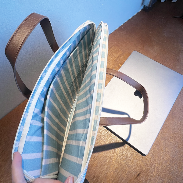 | オーダーをいただいて作ったパソコンバッグです。 自分が持っていたものを参考に、同じ大きさで作りました。 透かしホオズキをデザインした生地を表に、同じ色を使ってデザインしたストライプの生地を裏生地にしました。 デザイン: Fancy Lantern Plants (beige) / Cozy Stripes (green) コレクション: Fancy Lantern Plants |