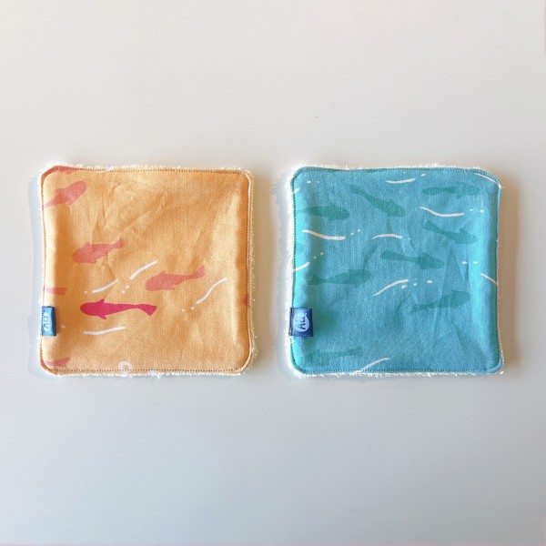 | 裏面にオーガニックコットンを縫い合わせたミニタオル。 小さな魚たちが群れになって泳ぐ、シンプルなデザインです。この夏は大活躍しました。 デザイン: Aquatic Symphony コレクション: Celestial Treasures |