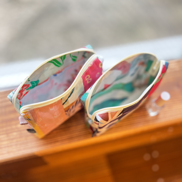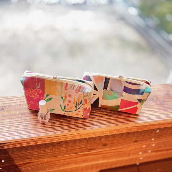 | マチが広めの化粧ポーチ。表地はパッチワーク、中ポケットもつけました。 何個も作るとだんだんコツが分かってきます。 |