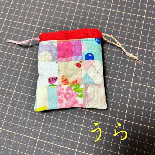 はぎれを繋げてミニ巾着袋。