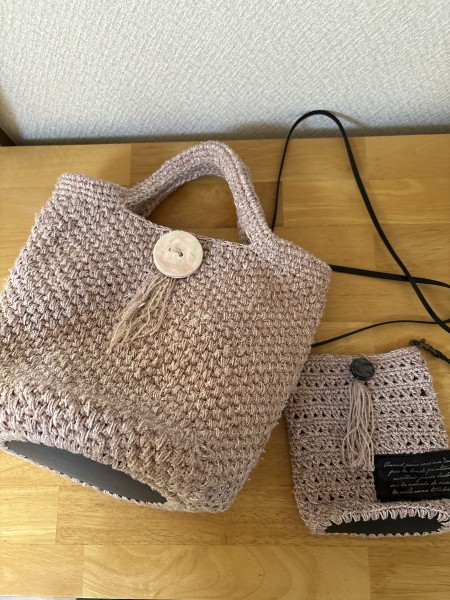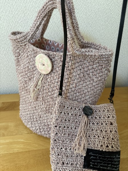 | コットンのかせ糸を2本どりで、円形と小さな長方形のバック底板を使用して、トートバックとスマホショルダーバックを編みました。 | |