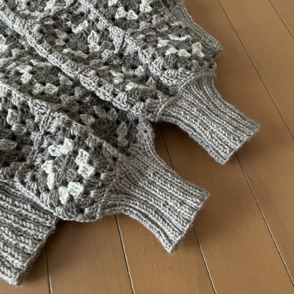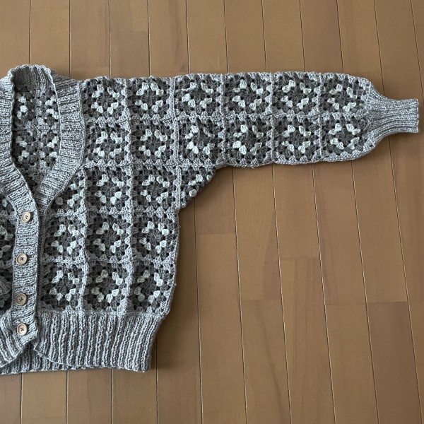 | モチーフを繋げたカーディガンを編みました。長い道のりでした…。 地道にモチーフを編み、繋ぎながら大きなパーツを作り、さらにそれを繋げてから、棒針で裾・襟・袖口を編みました。 棒針は裾と襟に4号輪針60㎝、袖口は4号4本針を使用しました。二目ゴム編みです。 |
