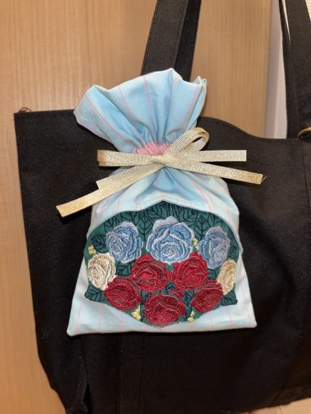 PCで機械刺繍のデータを作り、ブーケに見える巾着を作りました。