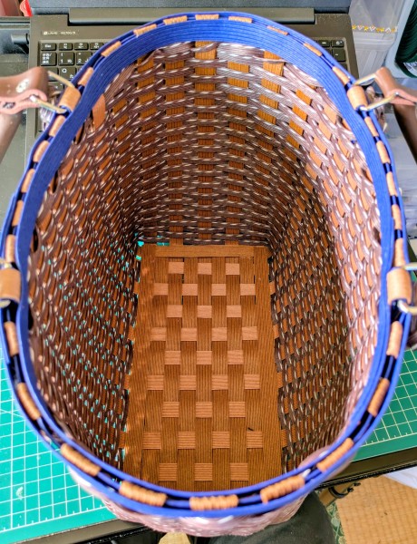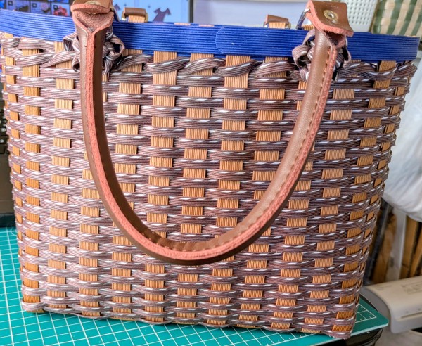 クラフトバンド6本幅で作りました。取っての下に ワンポイントに 花結び を付けました。最初は横幅25㎝で編んでいるうちに 31㎝と大きな大きさになってしまい、バッグそのものが丈夫になりました。