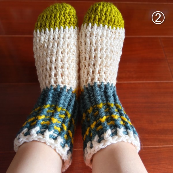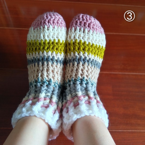 | 前回と同じ #リカチャンネル編み物部 さんの動画を参照して編んだルームソックスです。 残り糸がたくさん消費出来ました。 ➀ 足首の糸が太かったので、ちょっとブーツっぽくなりました。 ➁ 1番色合わせに迷いました。かかとも緑にする予定だったんです。 ➂ 残り糸の在庫が少なくなり、かなり無理矢理編んでます。すごくカラフルだけど、なんとなくまとまったかな。 |
