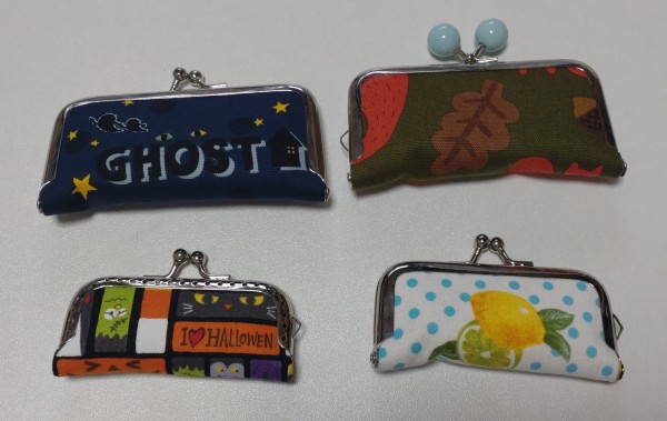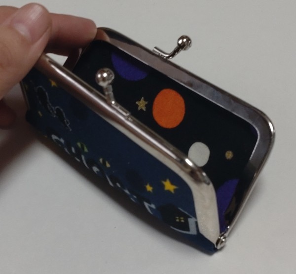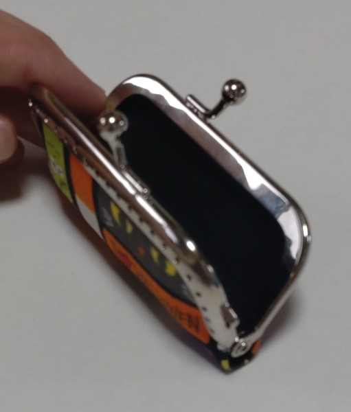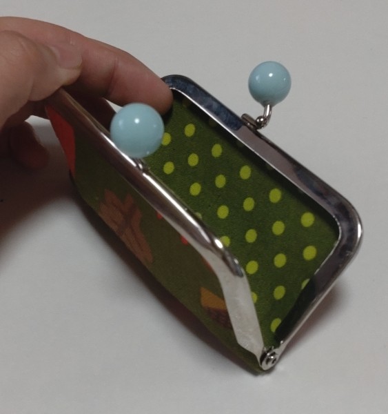 100均のがま口を使って小さいがま口ポーチを作りました。縫わずに両面接着の芯材に布を接着して作りました。リップクリームを入れようと思ったのですがリップクリームが大きくて入らず、小さな物を入れています。