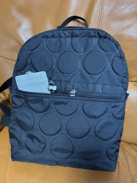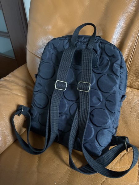 ナイロン素材のコンパクトリュック。徒歩通勤用に手ぶらで歩ける様、軽くて撥水性のあるナイロン素材で作りました。黒だけど水玉模様でオシャレに仕上がりました。
