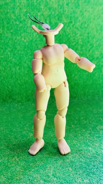 | 自作のボールジョイントドールボディーです。 古典的な紐引き構造ですが、材料と構造を激選して、重たい頭部をつけても、短時間なら自立する構造にしました! サイズはオビツ11と香港や台湾などで人気の1/8ドールの間ぐらいのサイズです。 首ジョイント、は、ねんどろいどやymyドールと互換性があります。 手は取り外しが必要だったのでどうしようかアレコレ悩みましたが、パーツにスリットを入れて、腕の方にソフトレジンを塗る事で解消しました! |