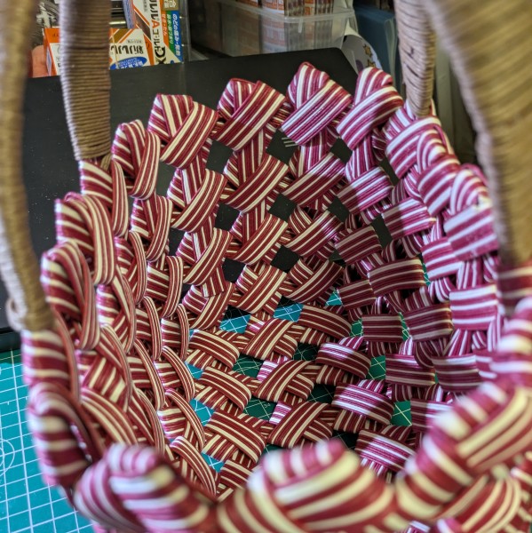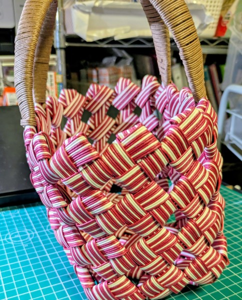 クラフトバンド12本幅で 四つだたみの小さいバックを 作りました。