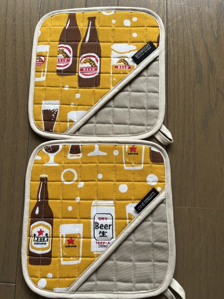 | 柄物の布は一枚の手ぬぐいです。約20センチ四方の鍋つかみ2枚と13センチ四方3枚、10センチ四方2枚のコースターができました。 楽しい柄の手ぬぐいをたくさん見つけたので、調子に乗っていっぱい作りました。 |