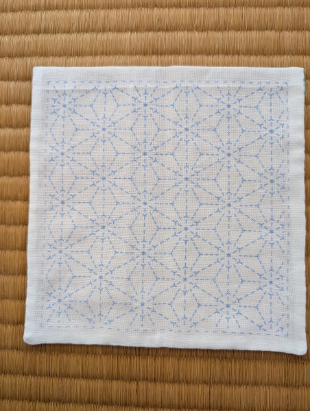 まず、ふきんの形に仕上げました。縫い代が中に入るので、刺し子の外側の枠に縫い代がかぶらないように、縫い代は5mm程度に切ってから仕立てます(布が4枚重なると刺しにくいのです)。