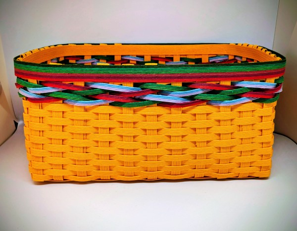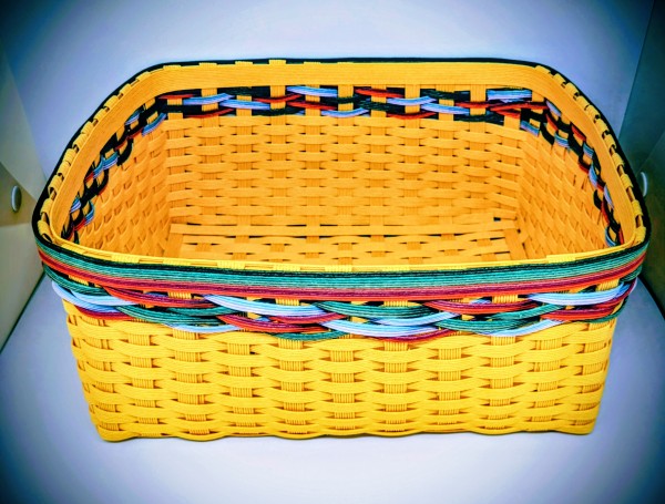 クラフトバンドで作った ビタミンオレンジのかごが売れたので、海外製のターメリックでかごを作りました。