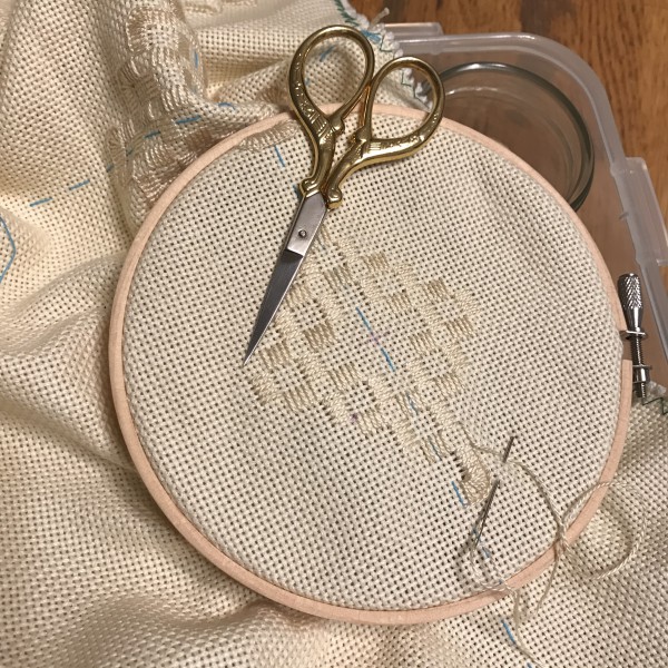 ひたすらチクチク縫います。だいぶ慣れてきました。荒い目の布にしたので目が楽になりました。