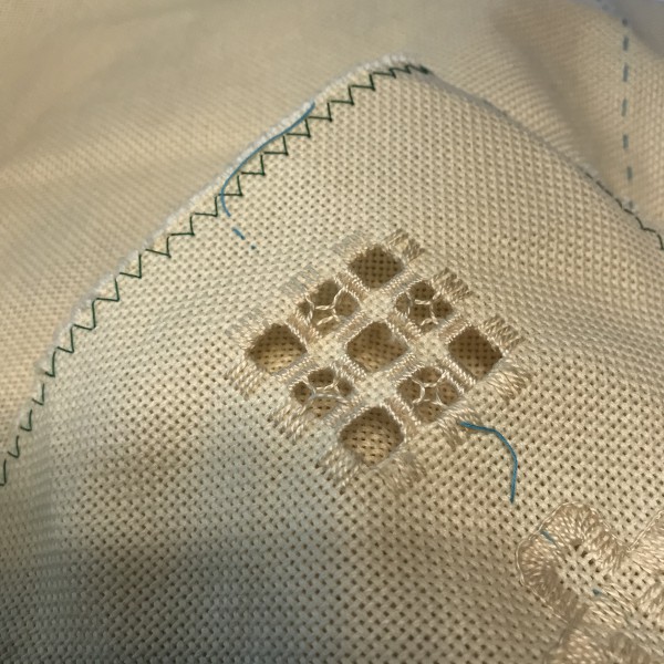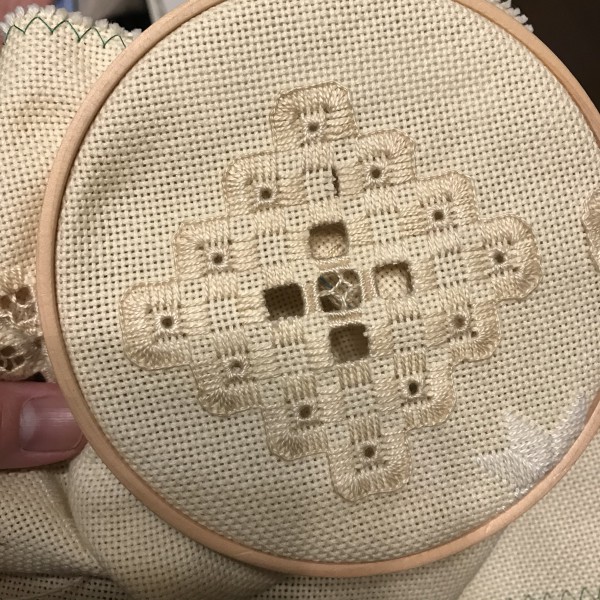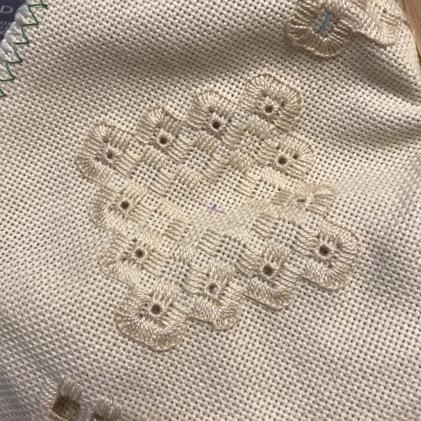 アイレットステッチを入れてみました。現役の時はこれはやらなかったなー。これは結構刺しやすい。一つステッチを覚えたよ♪