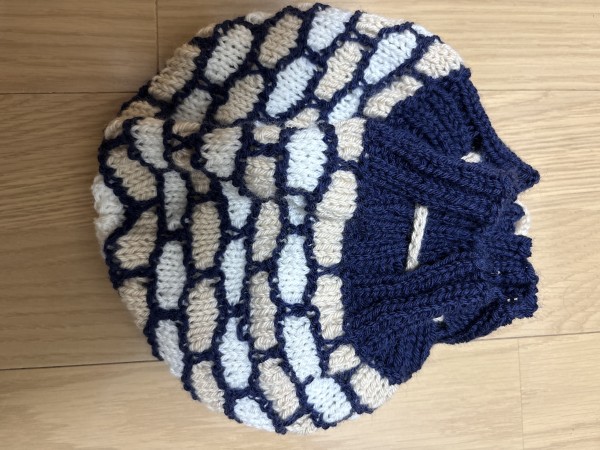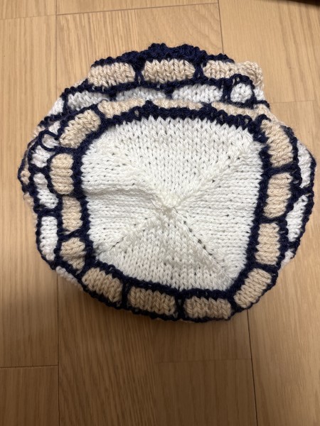 輪針を使っています。底を編んだ時に、減目の所が緩くなってしまったのか、底なのにかなり隙間ができてしまい、糸始末をしながらかがって隙間を埋めました。紐はスレッドコードです。