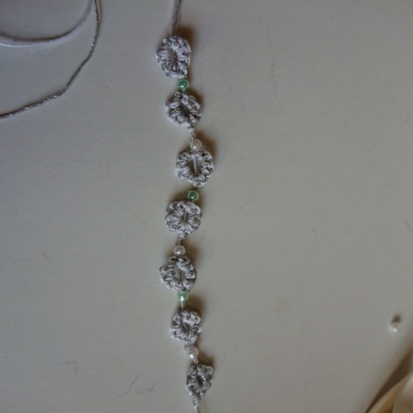 リングを作り糸玉の方の糸を裏側から渡しピコ繋ぎをして、シャトル側の糸に通しておいたビーズを一つ下ろして、リングを作ることを繰り返す