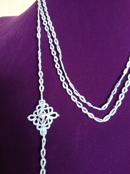 | タティングレース ネックレス スプリットリングひし形モチーフを続けて編む 160cmのラリエットが完成 |