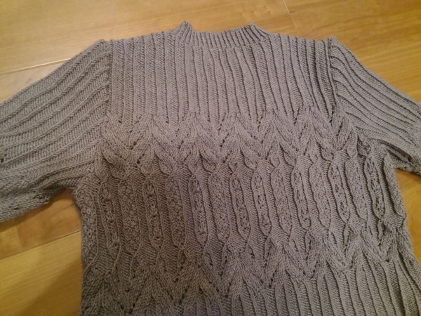 模様編みのセーターです。「クチュール・ニット11」の15を参考に、身頃の模様を少し変え、えりぐりをねじりゴム編みにしてあります。