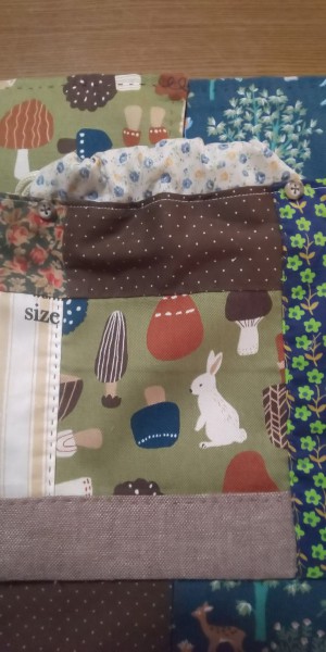 秋色の生地をお店で見つけて、購入しました。動物の柄を生かす様にパッチワークして、巾着を作りました。マットは、芯を入れずに作りました。