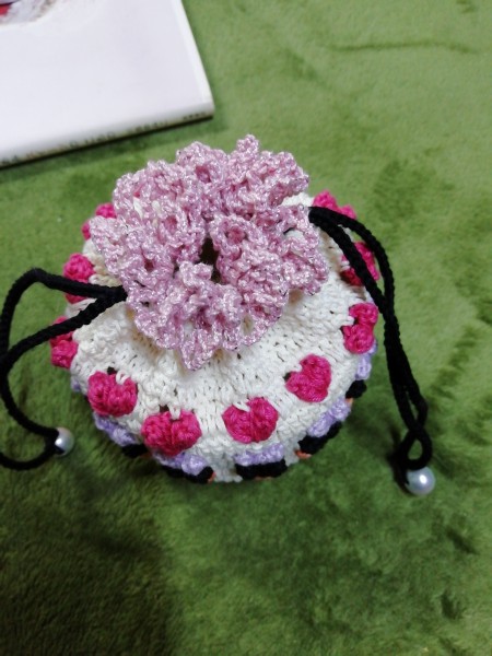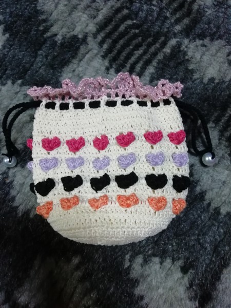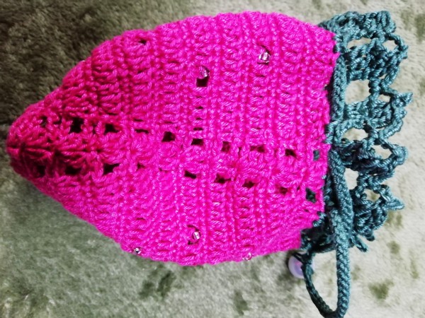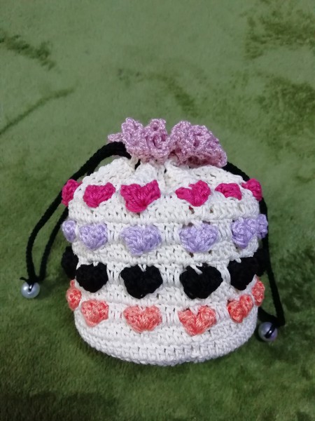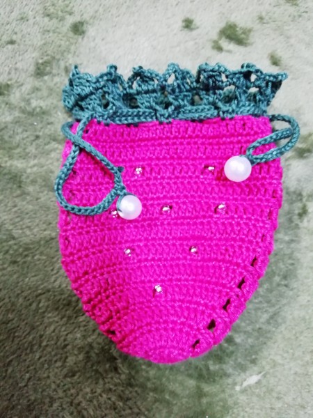 いちごポーチ 長編みバージョン ビーズ編み込みとハート巾着