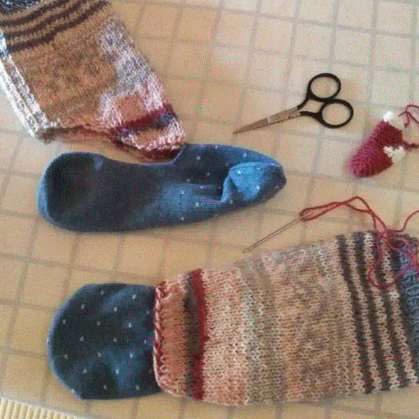 | フットカバーの足首から上を編んで止めつけたら暖かくて靴も履きやすいのでは?と思いつきました。 片方編んだ時点で色出しや編み方を変えたり(4枚目) 仮縫いまでやったところで(3枚目) 縫い止めないほうがずっと使いやすいことに気づきました。 筒形のアンクルウォーマーよりずっと暖かいし、靴の上にベロを出すとブーツっぽくなります。 薄いほうが好みなので履くくつ下は編まないのですが、 使わなかった赤い糸で「かかと」と「つま先」のあるミニくつ下を編みました。 |