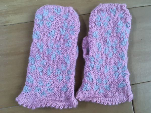| 子供用ミトンです 桜の模様を編み込みました 子供がわたり糸を引っかけないように、こmqかく編み込んでいます |