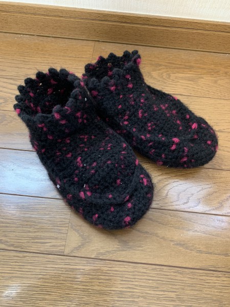| 毛糸在庫消化を兼ねてルームシューズ。 糸の量が少なめだったので市販のフェルト靴底で節約しました。 基本は中長編み、甲の部分だけ細編み。 |