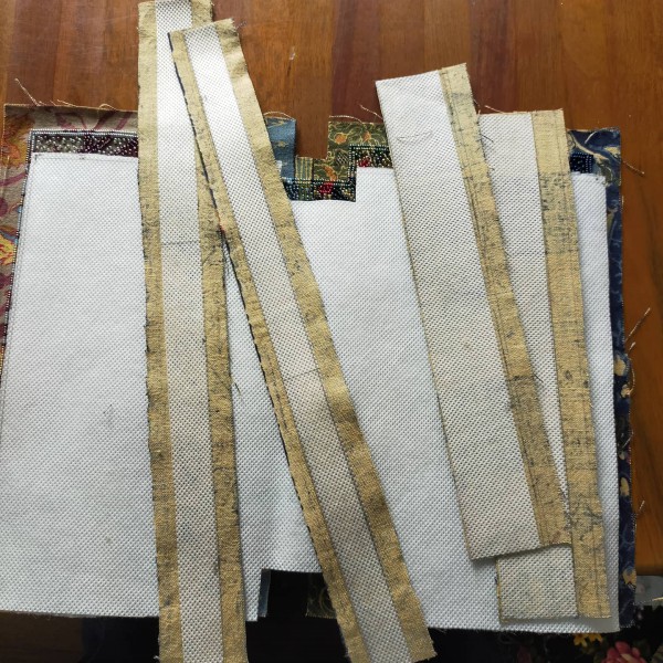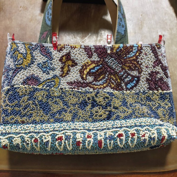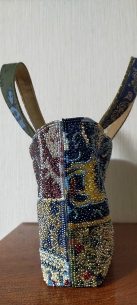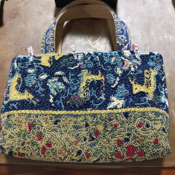 柄物の布にビーズを刺して、トートバッグを目指します。