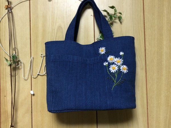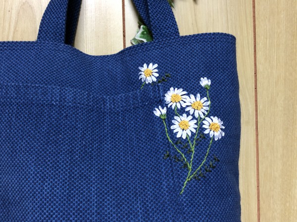作務衣のリフォーム。前見頃のポケットを外ポケットとして利用しました。カモミールの花をリボン刺繍しました。