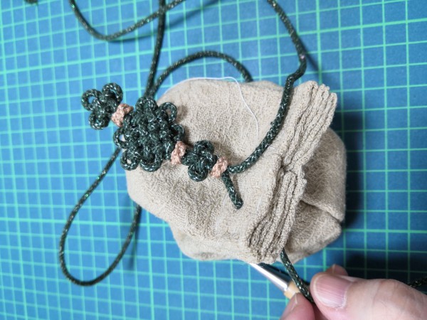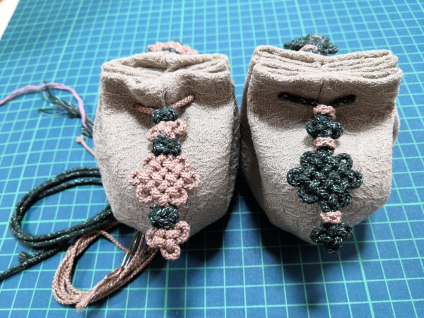 | 作品/飾りジュモニ 該当するカテゴリーがありません。 縫い物ではなく、組みひもして作った紐で結んだ韓国の飾り結びメドゥプがメインです。 1個目はベージュ色の紐のジュモニで、袋の開け口の高さが揃わなかったため、つ作り直しの2個目がグリーン紐です。 組みひもは、頑張って1日で終わらせました。肩こり酷くなりましたが。 ジュモニは母の古い着物を解いた布を使っています。 結びは、センチョク→カラッチ→クッカ→センチョク→カラッチ 1個目のカラッチは大きく太く可愛くなかったので、2個目では1周結びの変えて小さくしました。 #メドゥプ #ジュモニ #韓国結び #飾の結び #くみひも |