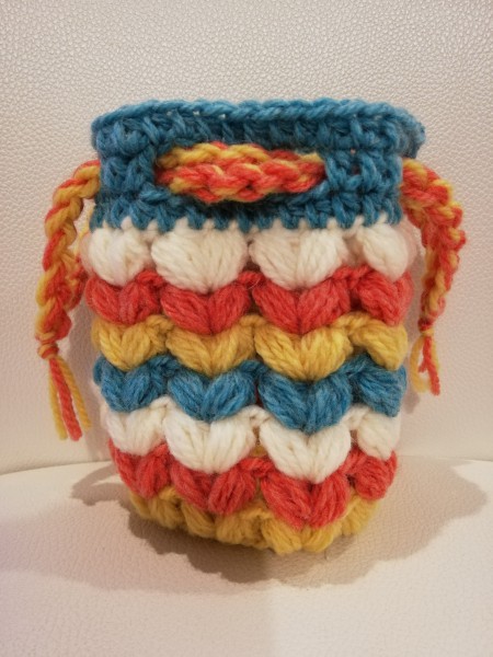 | YouTubeで見たモコタロウさんのハートだらけの巾着ポーチを作ります。 甘くなりすぎないよう 青と白の毛糸にします。 と思いきや、途中で変更しました。 最初の毛糸は、ハートがヨレヨレになってしまい、練習のつもりで余った毛糸でつくったら、案外いい感じ☆これで完成とします。 青と白の毛糸の組み合わせもかなり私好みなので、別のものを作ろうと思います。 ○側面 玉編みでハート7段 片側4回 ○上部 中長編み3段 紐を通す穴を付けました。 ○底 丸底 こま編み 往復編み5段 ○巾着の紐 2本取りくさり編み |