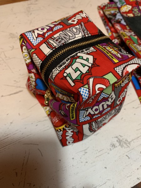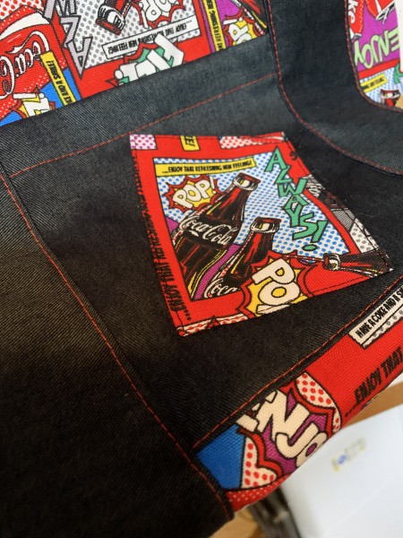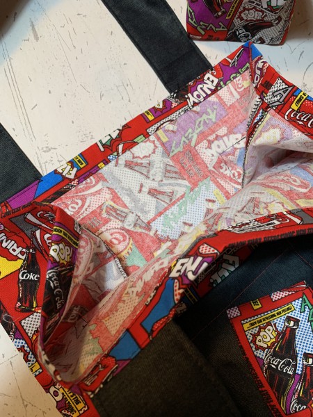 コカコーラコラボ生地でバックを作りました。持ち手も作り肩掛けタイプで使いやすいと思います。生地が余ったのでポーチもついでに作りました。