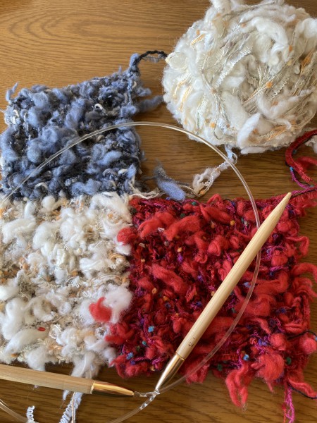 白、赤、グレーの糸を買ったので、ドミノ編みでパッチワーク風の座布団カバーができました。