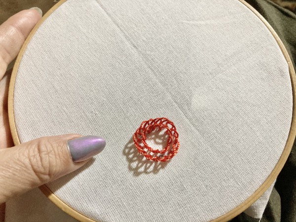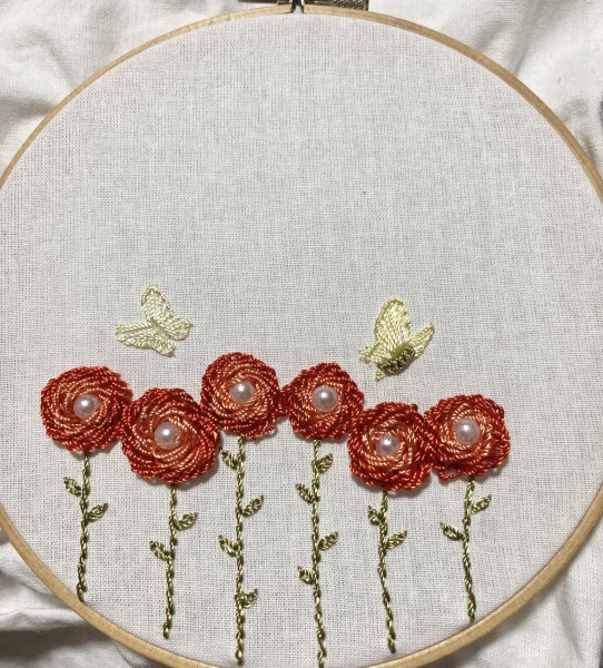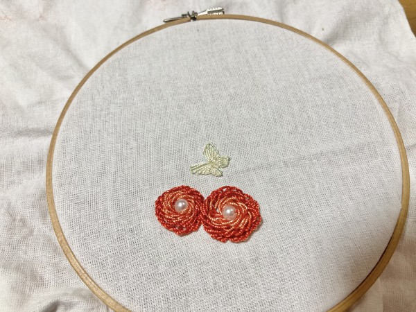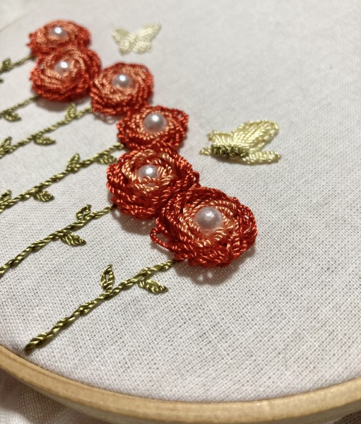 | 花をチクチクします。デザインは縫い進めながら考えます | |