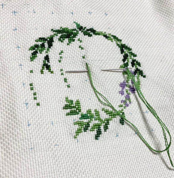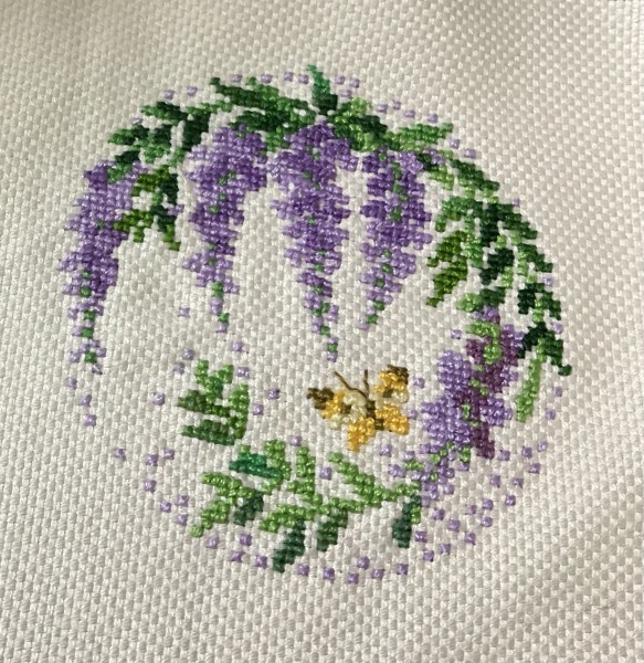 色は手持ちの糸で藤の色を右側の赤みのある紫にしたところしっくりこなかったので