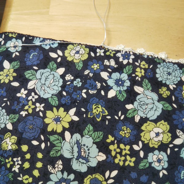 YUWAの布をハンカチに仕立てて縁編みをしました。前回のハンカチと縁編みの色を変えたので少し明るい印象に仕上がりました。