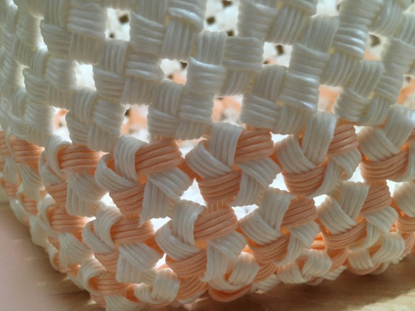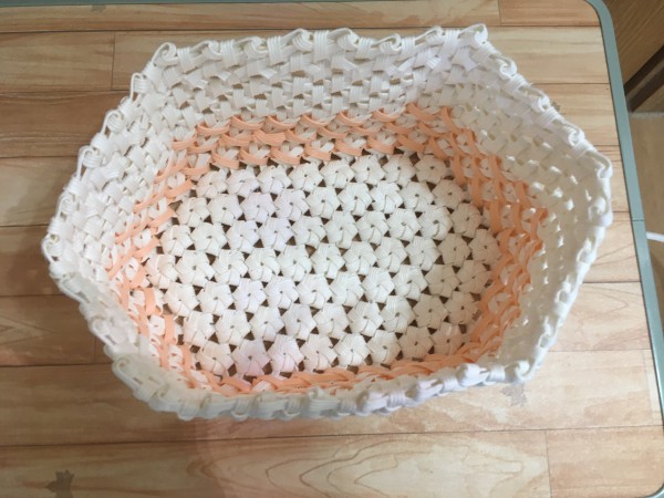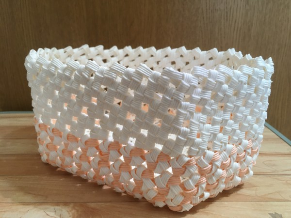 「四つだたみ編みで作るクラフトバンドの和モダンなバッグとかご」の作品を参考にしています
