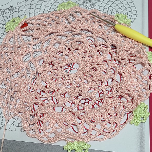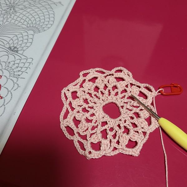 13段目編み中です。オリジナルはWhiteのみですが、色変えてみました。 体調と相談しながらなのでまだまだかかりそう。