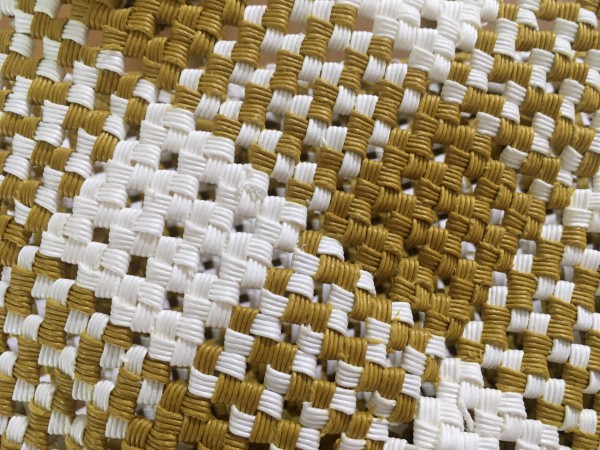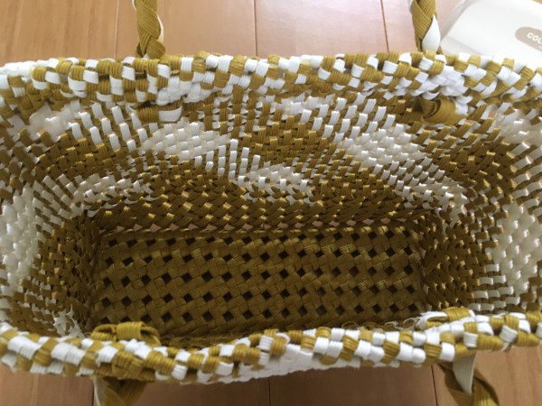 「四つだたみ編みで作るクラフトバンドの和モダンなバッグとかご」からチェックの切り替えバッグです